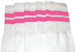 Knee high white tube socks with Baby Pink/Bubblegum Pink stripes