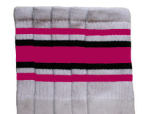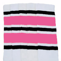 Knee high white tube socks with Black/Bubblegum Pink stripes